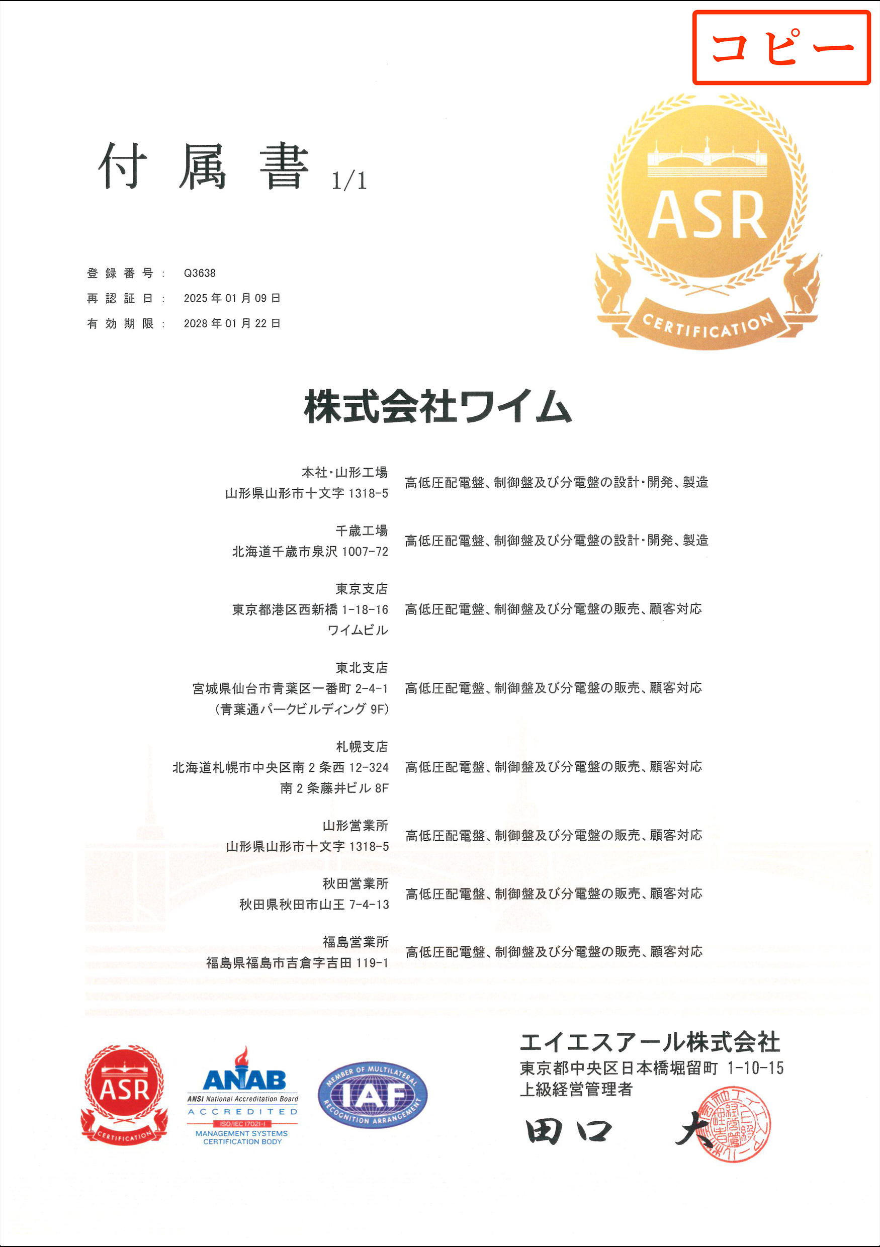 ※ 当社は各支店・工場ごとにISO9001を取得しています